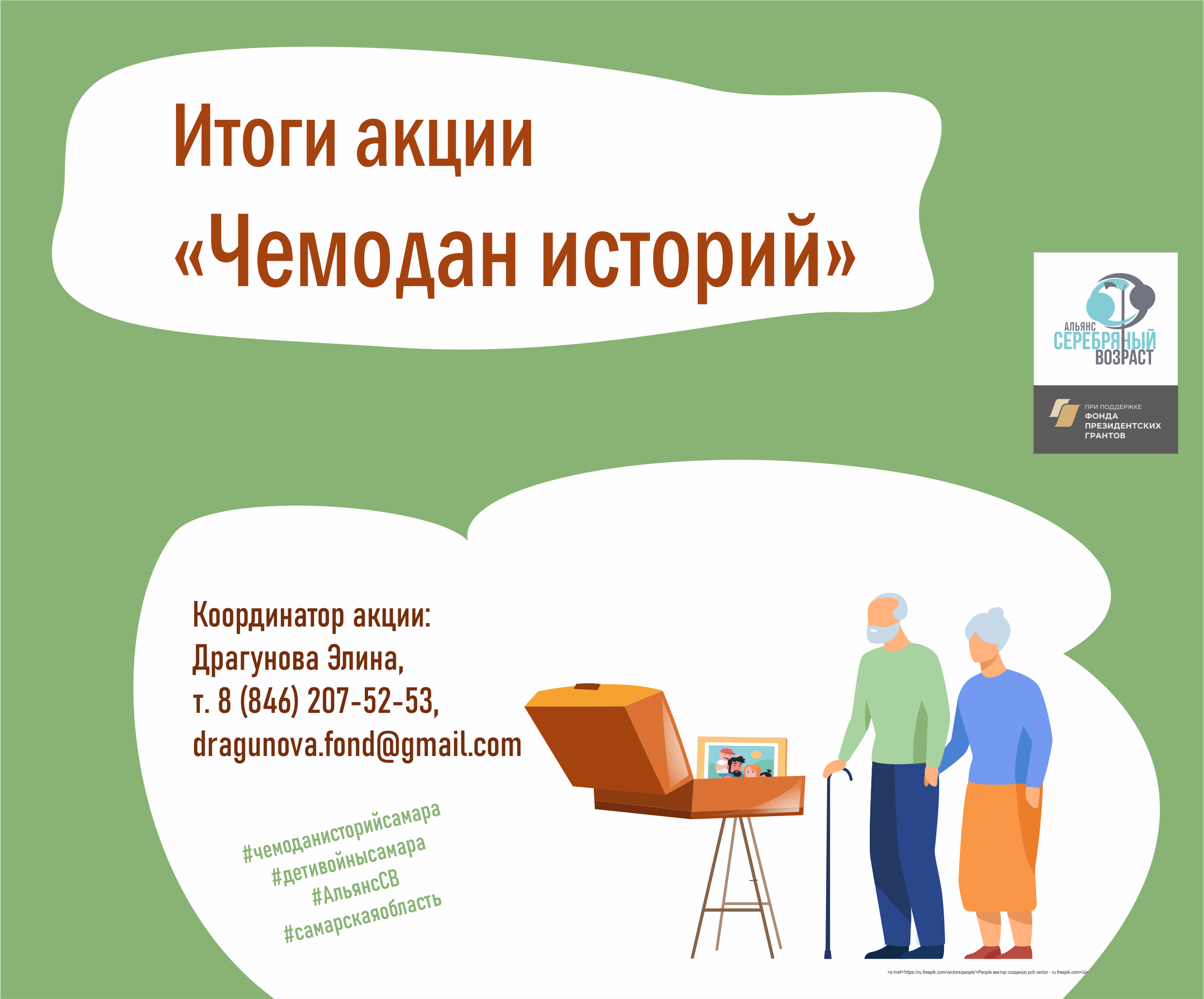 Альянс "Серебряный возраст" приглашает вас на итоговое мероприятие акции "Чемодан историй", которая помогает нам сохранять историческую память через истории людей, семей, страны. Простота акции и её эффект помогают присоединиться любым организациям и включить её в свою работу. В 2021 г. акция прошла в 10 регионах России. Мы подведем итоги, обсудим, что получилось и какие новые идеи возникли, поблагодарим участников.